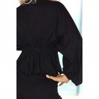 Conjunto sexy de dos piezas de agradable tacto de algodón y elegante encaje. Puede ser tanto un pijama como un conjunto para la casa. Fantástico top corto con mangas anchas que deja ver la cintura. Pantalón largo y cómodo acabado con ribete de encaje.