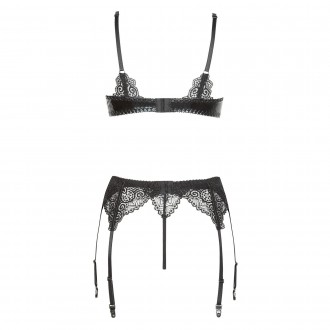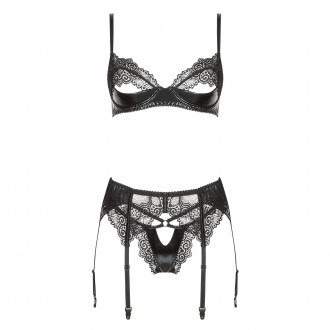 Exclusivo pero al mismo tiempo extremadamente sexy y sensual conjunto hecho de material elástico, brillante y hermoso encaje. El busto parcialmente rígido tiene agujeros en el centro.