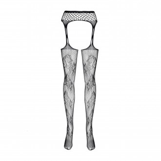 Medias negras de rejilla combinadas con un cinturón. Tienen un estampado floral por delante y por detrás y "cristales" de varios tamaños repartidos por toda la prenda.