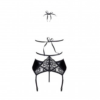 Descubre el sensual Conjunto Alanis, diseñado para acentuar tu silueta femenina y aumentar tu confianza. Este conjunto único consta de sujetador, liguero y tanga, confeccionados en delicado encaje negro y material brillante, que crean un look inigualable y sexy. El sujetador presenta un encaje floral que realza bellamente el busto, mientras que los tirantes verticales estilizan visualmente la línea del cuerpo. Los tirantes ajustables y el lazo en la espalda garantizan un ajuste perfecto y comodidad.