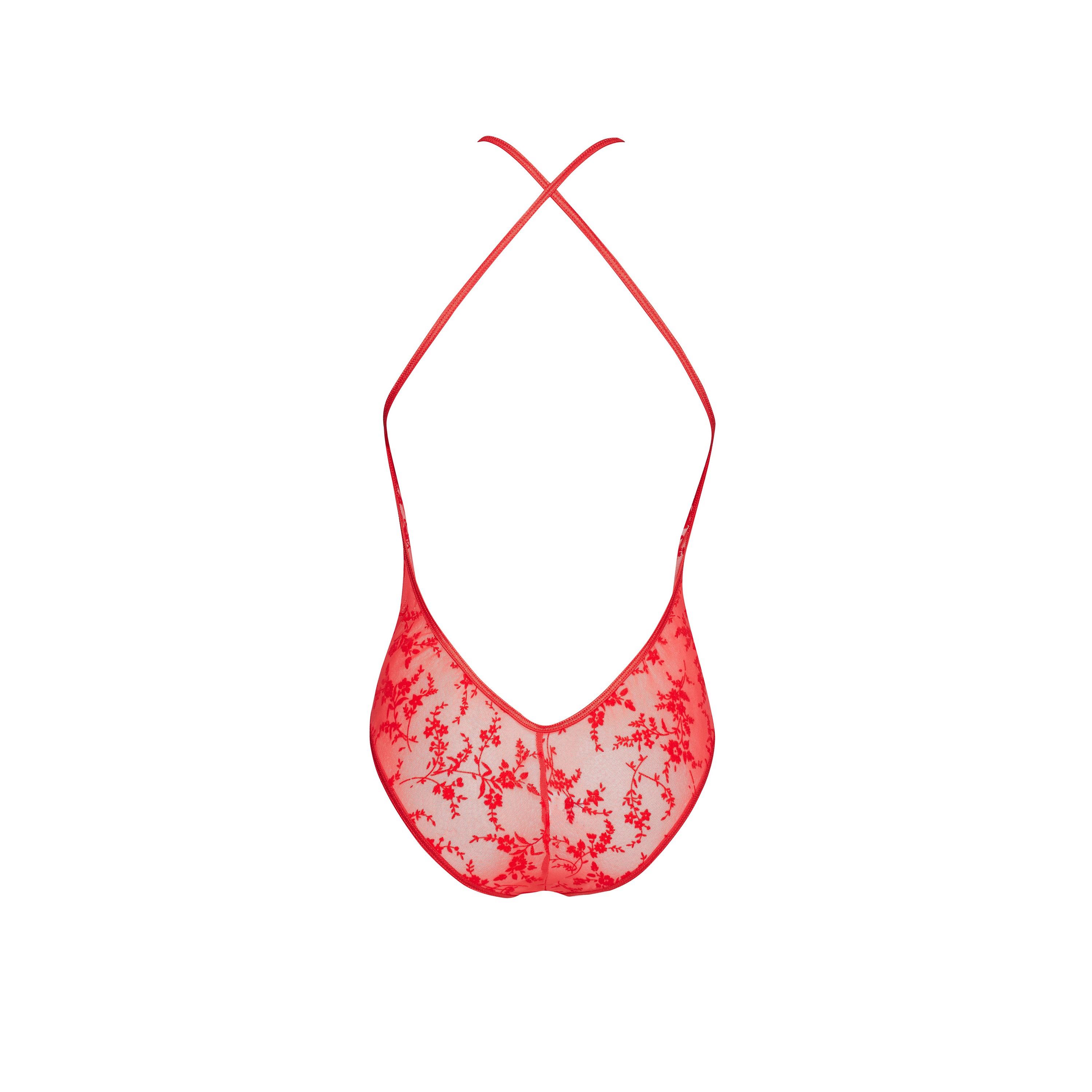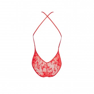 Seductor teddy de suave tul con motivos florales. El rojo intenso y los pechos y el vientre al descubierto atraen todas las miradas. Escote decorado con una aplicación plateada. Body abrochado con corchetes en la entrepierna.