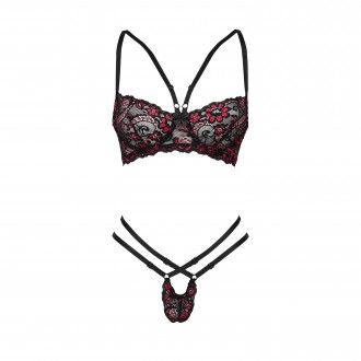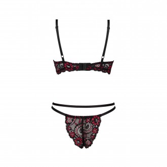 Rosalinda es un conjunto de lencería de encaje negro con brillantes flores rojas. Este conjunto realza las curvas de la mujer, aumentando su confianza.