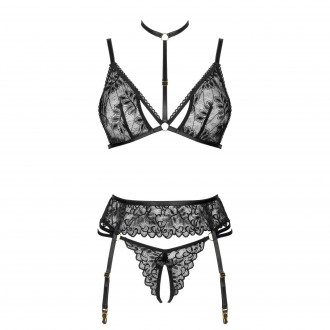 Descubre el excepcional conjunto de lencería Noemi set negro, compuesto por sujetador, tanga y liguero, que sin duda os encantará tanto a ti como a tu pareja.