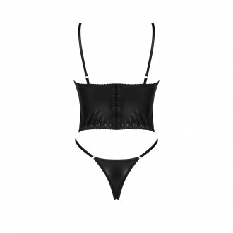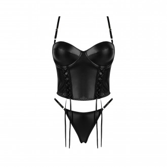 Un conjunto sexy confeccionado en ecopiel de color negro, perfecto para las mujeres que desean resaltar su confianza y su estilo único. El top corto - corsé con copas con aros proporciona una excelente sujeción del busto, y el cordón decorativo de la parte delantera añade un toque feroz al conjunto.