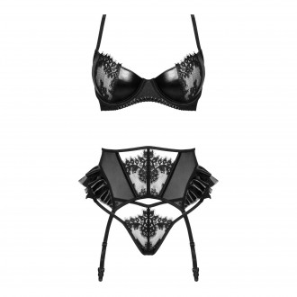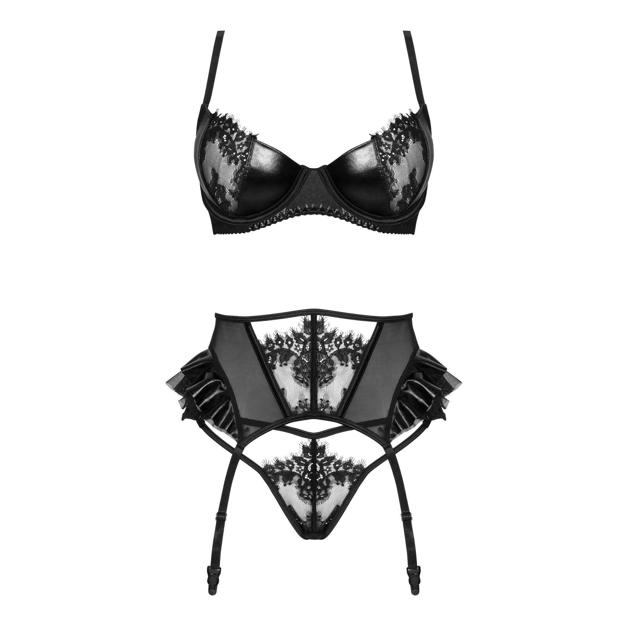 Este impresionante conjunto de lencería combina elegancia con un estilo sensual y atrevido. Confeccionado en tul de encaje negro y tejido wetlook, destaca perfectamente las curvas femeninas, aumentando la confianza. El sujetador con aros y copas de encaje realza hermosamente el busto mientras garantiza comodidad. El liguero alto con delicados volantes resalta la cintura, y las tiras ajustables permiten un ajuste perfecto. El conjunto se completa con un sensual tanga que armoniza con el resto del conjunto.