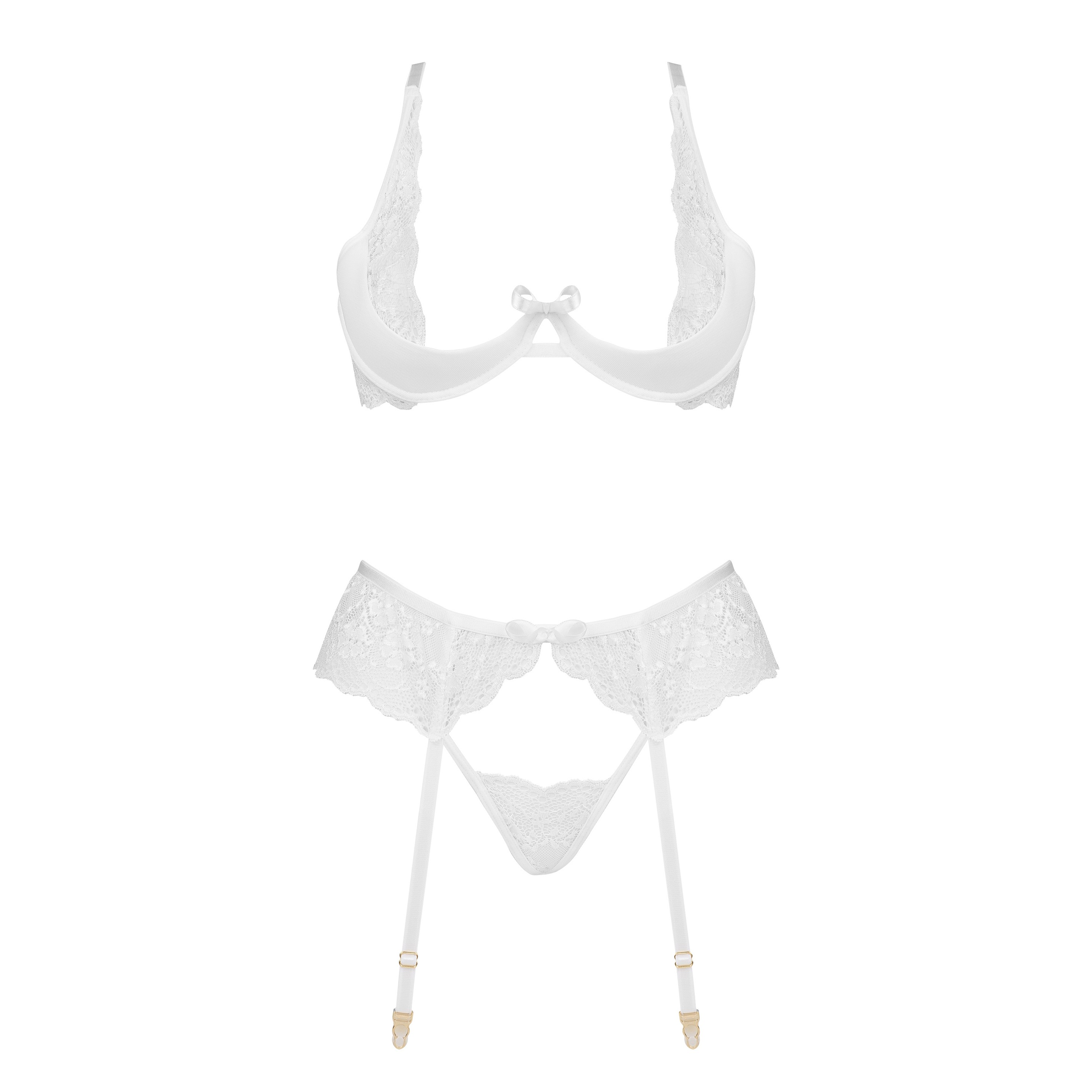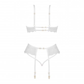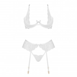 Presentamos el sensual conjunto de lencería blanca Rose set, que incluye sujetador, tanga y liguero.