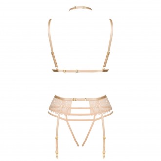 Conjunto de lencería clásica en color nude, compuesto por sujetador, braguitas y liguero.