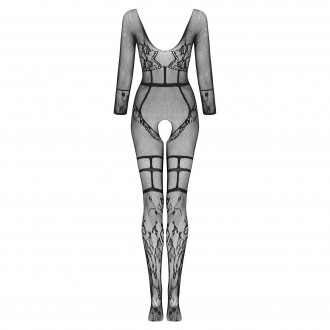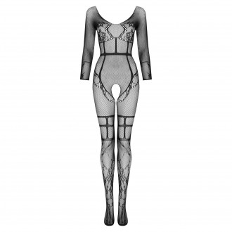Catsuit super sexy para las amantes de la ropa interior cómoda, confeccionado en delicado hilo negro. El motivo de rejilla se complementa con impresionantes aplicaciones florales y tirantes en la cintura y los muslos.