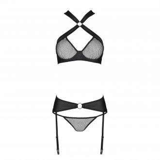 El conjunto Amanda combina elegancia y sensualidad, con un sujetador con copas reforzadas, un liguero y un tanga con eslabones dorados. Confort y sofisticación garantizados.