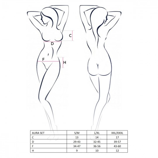 El conjunto Aura da Passion se compone de un seductor sujetador, un liguero y un tanga, con detalles de encaje elástico y ajustable para un ajuste perfecto y provocativo.