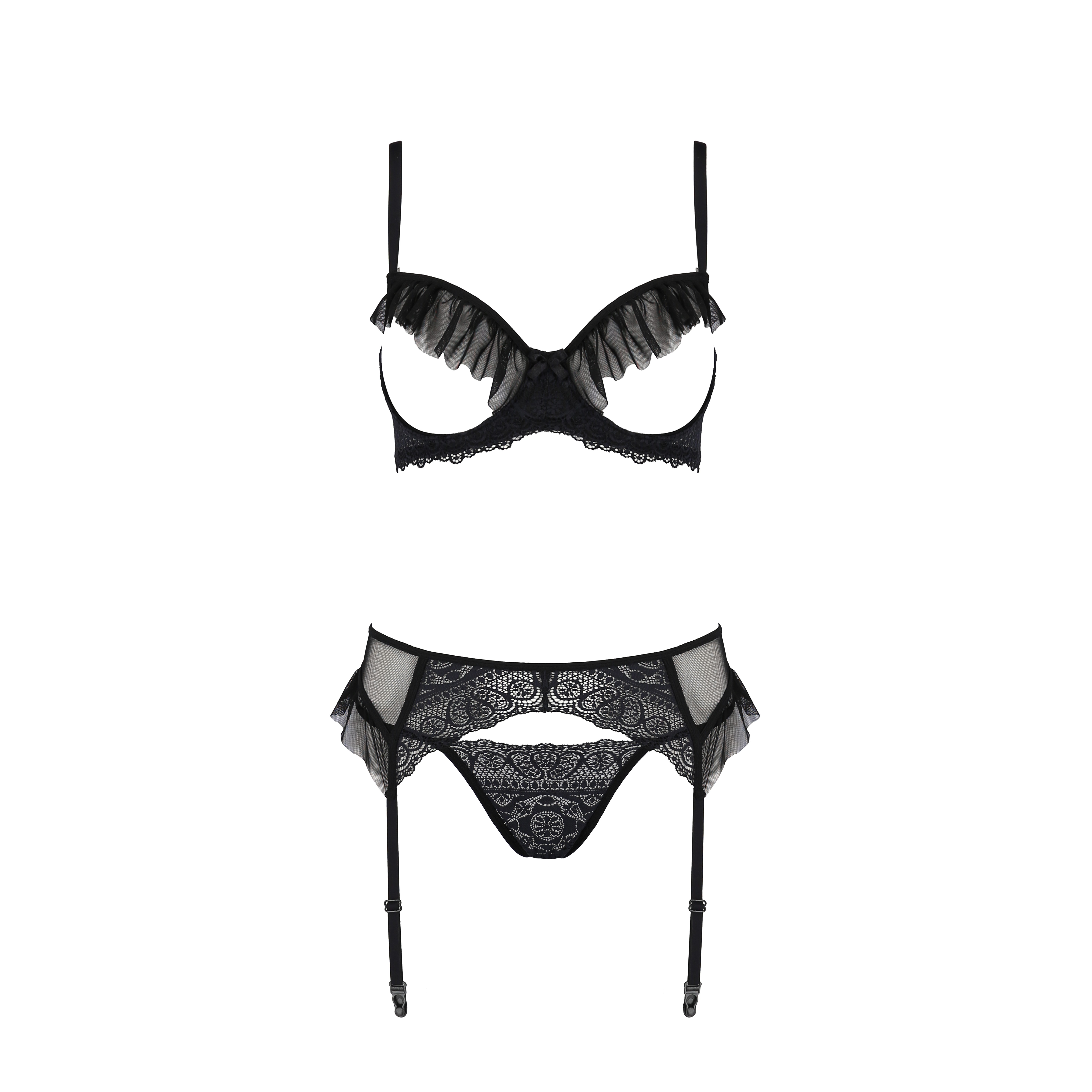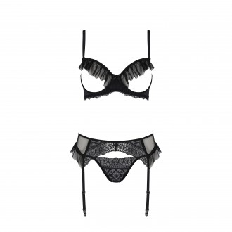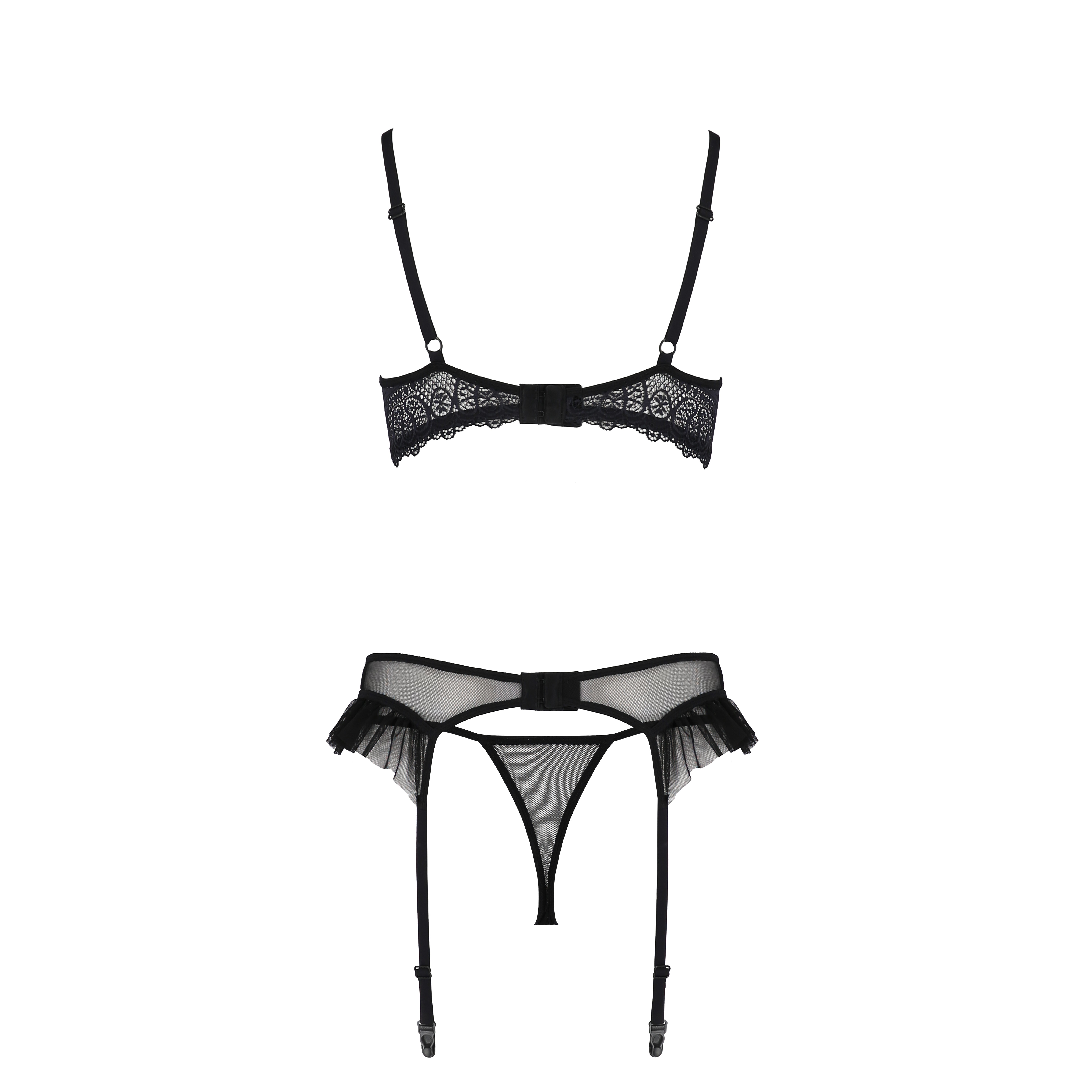 El liguero presenta volantes de tul que añaden un toque extra de sensualidad y elegancia. El sujetador, con abertura frontal y volantes decorativos de tul, realza el busto de forma atrevida y refinada, y las copas reforzadas con aros garantizan sujeción y comodidad. El tanga, también adornado con encaje, complementa a la perfección el conjunto.