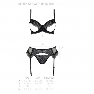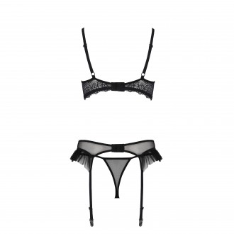 El conjunto Kerria consta de tres piezas irresistibles: sujetador, tanga y liguero, todas ellas adornadas con el mismo delicado encaje que destila feminidad y sofisticación.