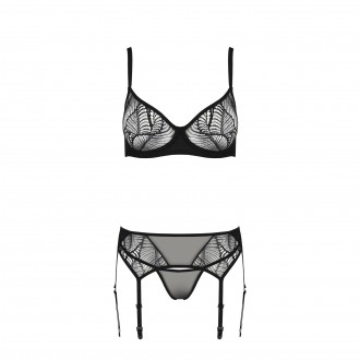 Conjunto de tres piezas compuesto por sujetador, tanga y liguero, fabricado con materiales reciclados y respetuosos con el medio ambiente. Elegancia, comodidad y sostenibilidad en un solo artículo.