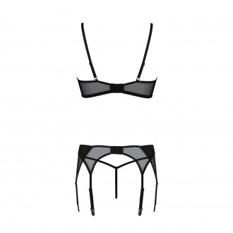 El sujetador con aros proporciona una sujeción impecable al busto, creando una silueta armoniosa, mientras que el liguero realza la cintura de forma delicada y añade sensualidad a la prenda.
