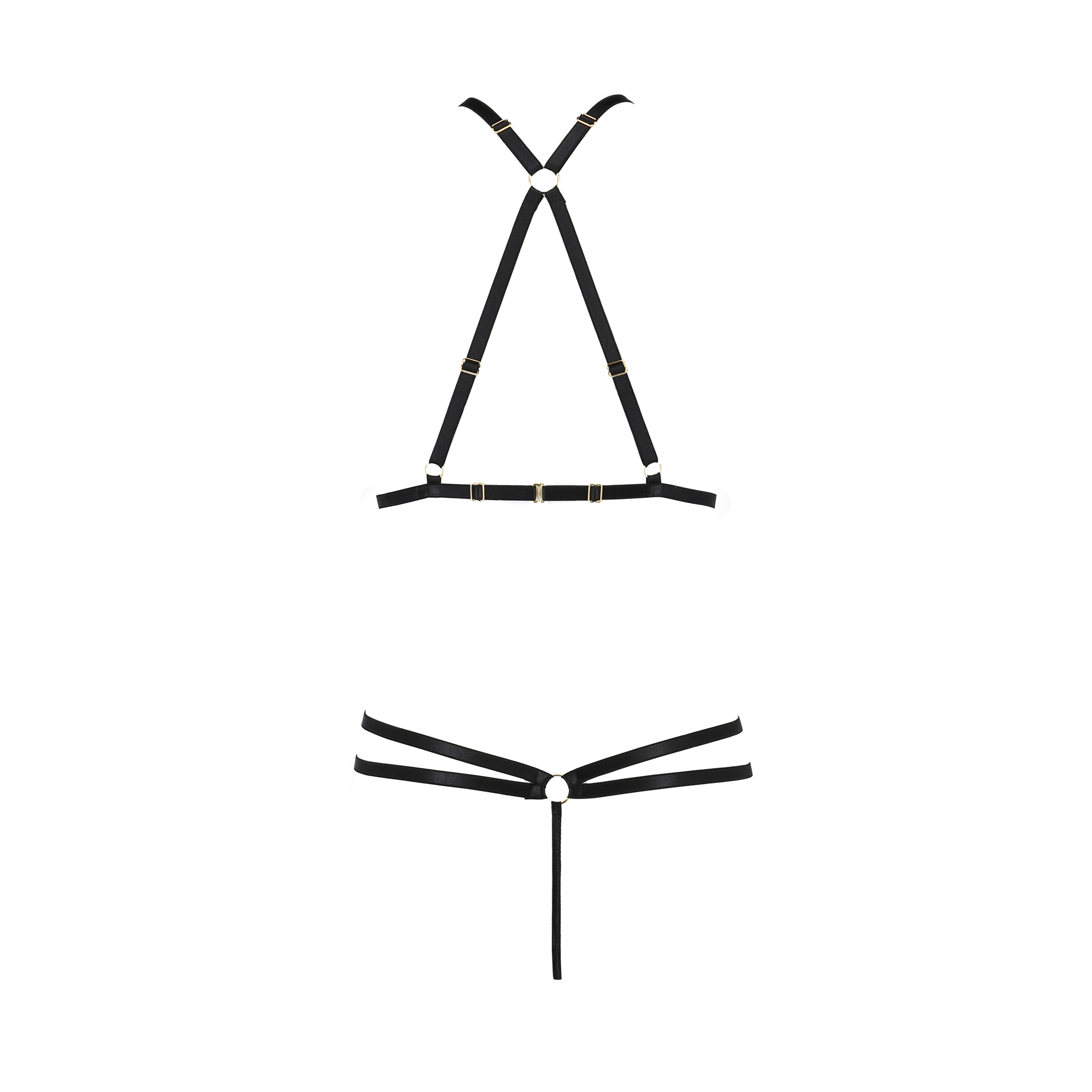 Compuesto por un sujetador abierto, un tanga igualmente atrevido y una gargantilla atemporal, este conjunto ha sido creado para resaltar los rasgos de la silueta femenina.
