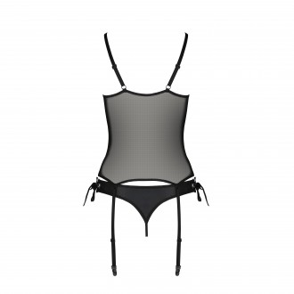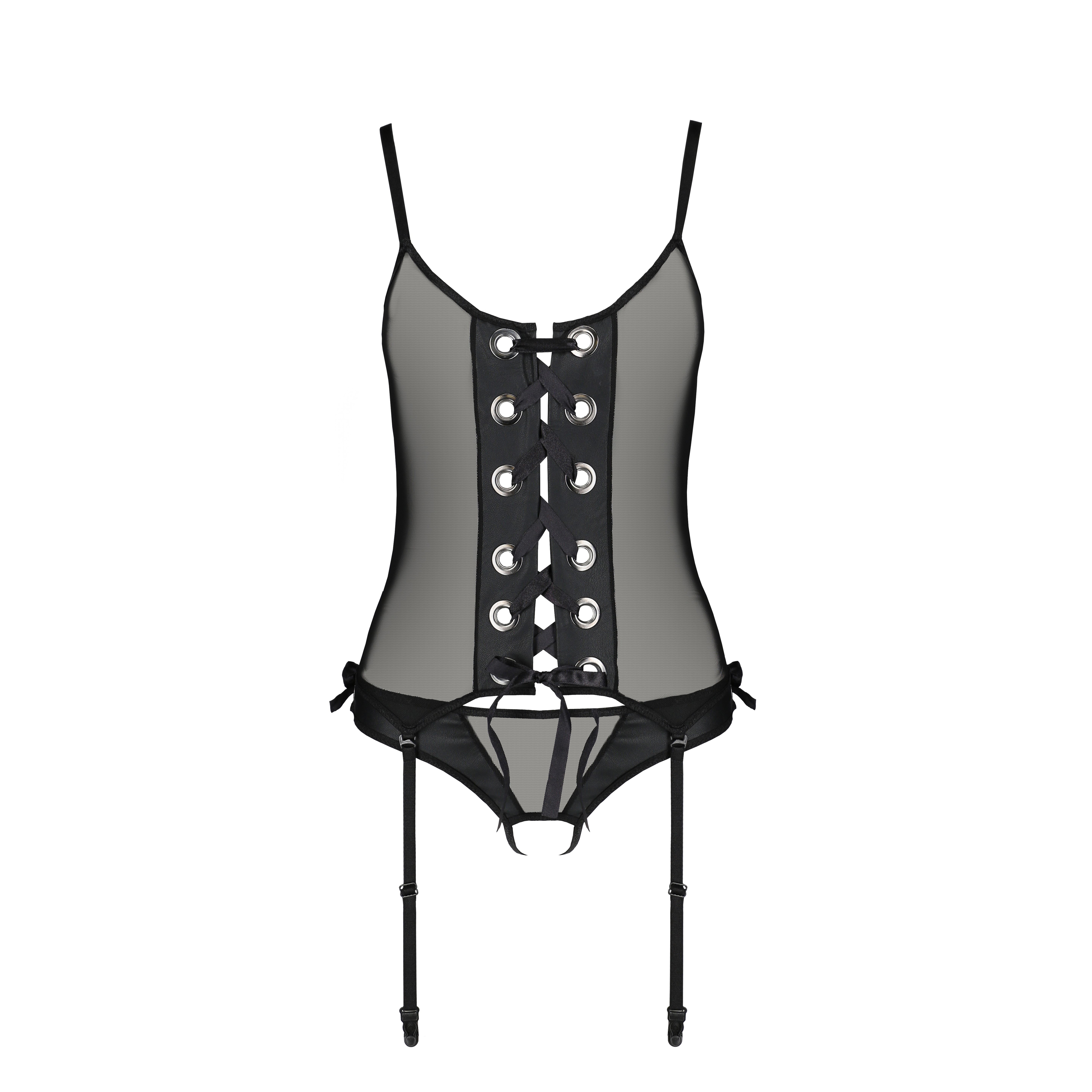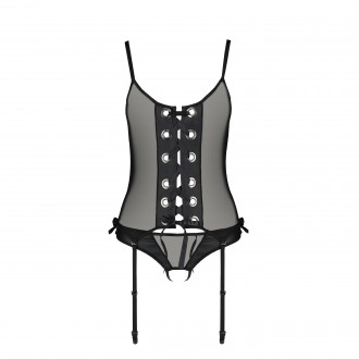 El corsé Nessy de Passion, de tul negro y piel, tiene anillas y cintas ajustables que crean un entrelazado sensual y sofisticado. El tanga abierto y las ligas complementan el look, ofreciendo elegancia y comodidad.