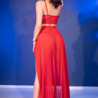 Un sensual conjunto de tul rojo vaporoso que acaricia el cuerpo como una delicada bruma.