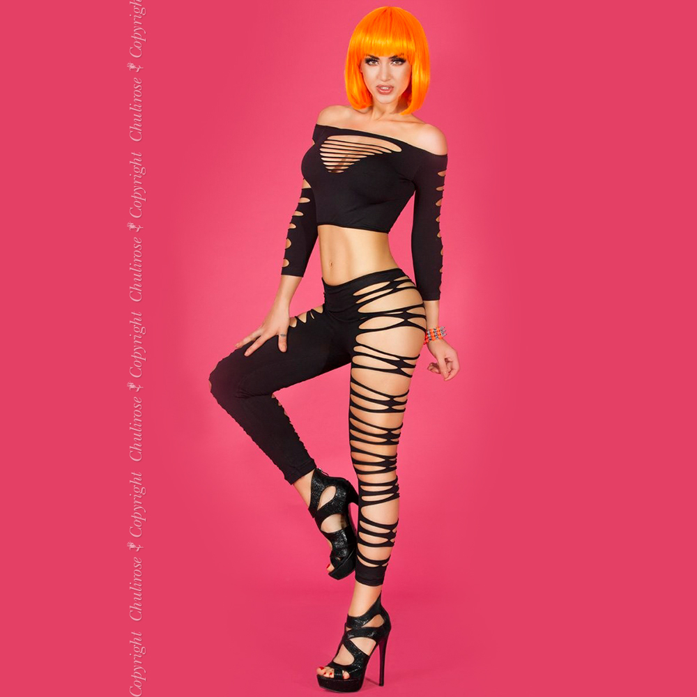 Un sensual conjunto compuesto por dos piezas, usted será aún más deseada. El top se caracteriza por una abertura generosa en el escote y en la espalda, y por sus mangas ¾ con varios cortes. Incluye también un par de leggings a juego, con aberturas en las laterales. Un producto de calidad de la marca Chilirose, presentado en una elegante caja satinada.